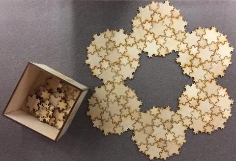 So that led to one of our first puzzles, which uses two sizes of snowflakes. I put the box of pieces in the Mathematics Commons at the University of Michigan. Both of the patterns below were created there.