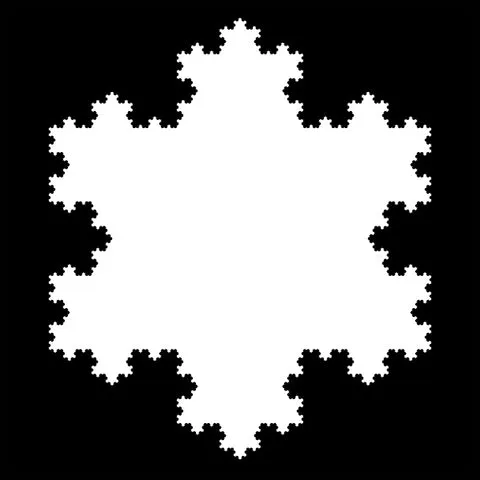 Like other fractal curves, it has an infinitely long boundary, and the self-similarity is obvious as you zoom in. One of the cool things about the Koch snowflake is that it can be built from six smaller snowflakes, leaving another snowflake in the middle. That of course can also be decomposed, recursively, giving you this: